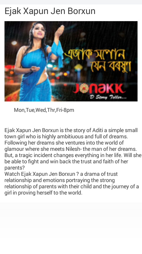 'Jonack ' a multi-genre General Entertainment Channel, primarily in the Assamese language, will be offering a variety of choices for all segments of the audience including fictional and non fictional programs, prime time drama series, reality shows, movies , comedy serials, theatrical films, music programs and musical shows, live performance coverage and telecast special and daytime drama etc. You can watch us on Digital.