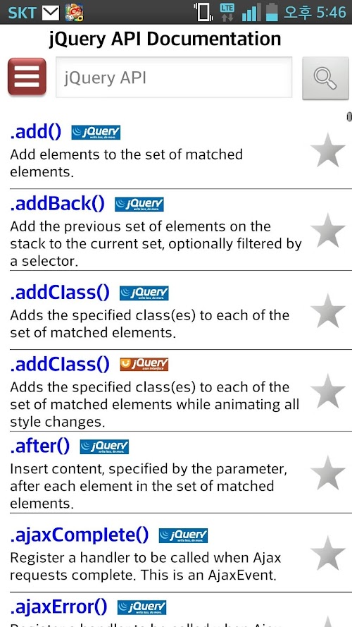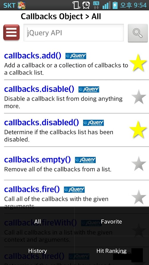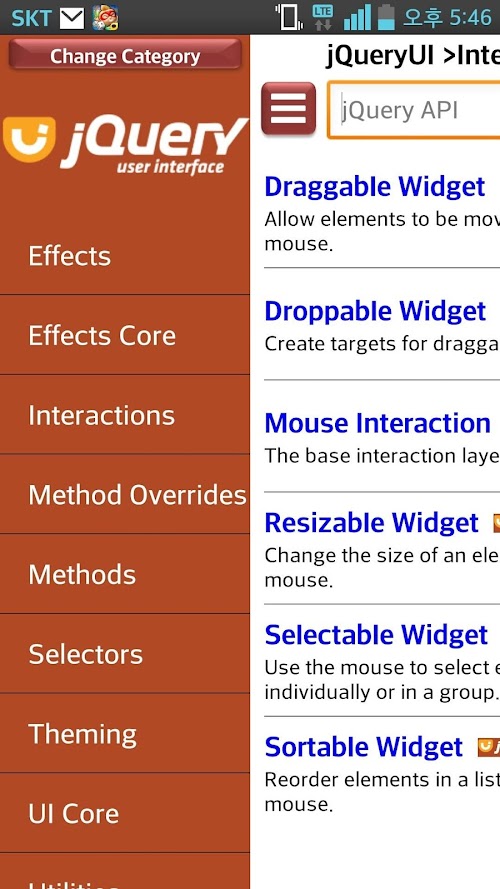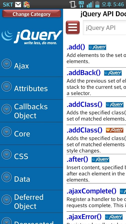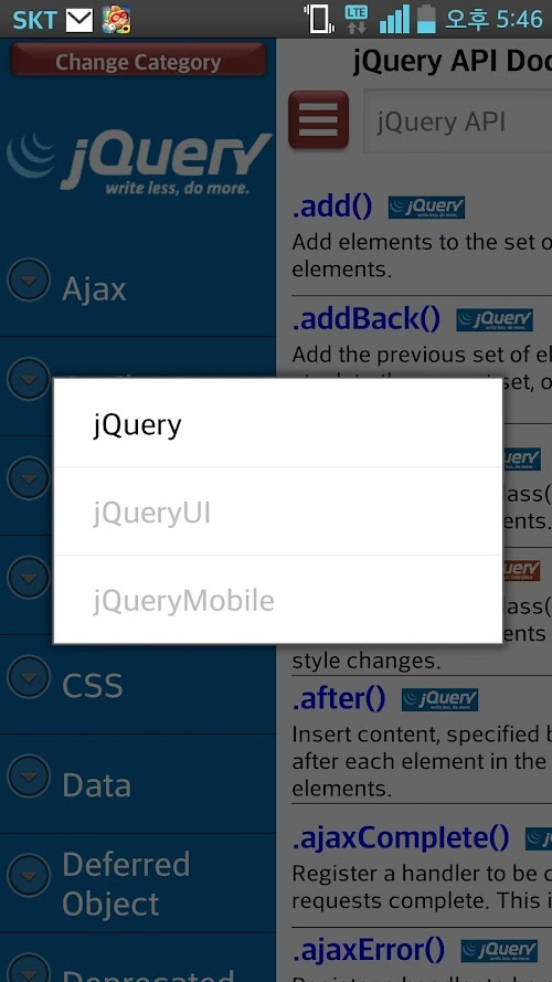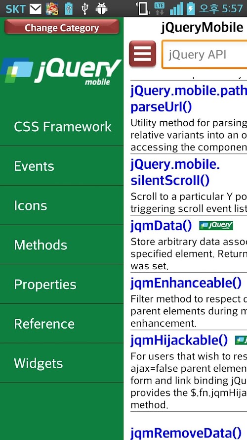 This app is jQuery API reference. jQuery, jQueryUI and jQuery Mobile API documentation are included in this app.