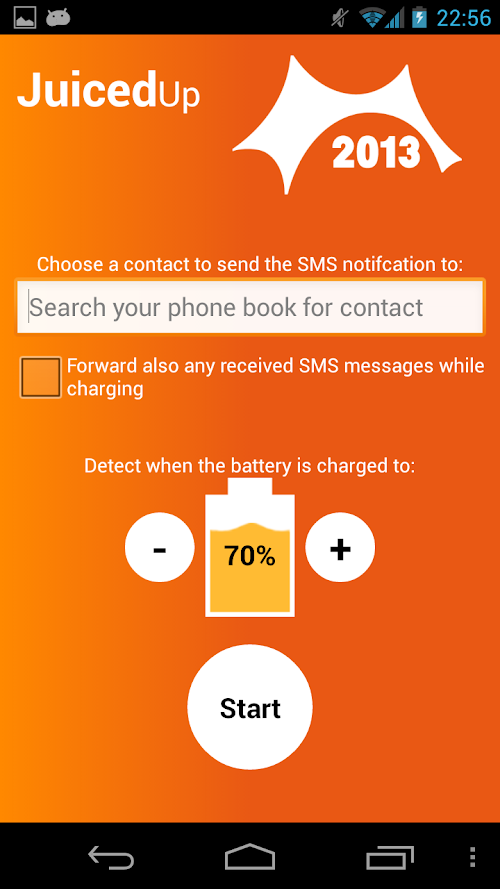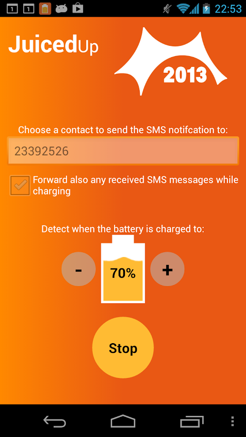 This app will notify you when your phone has been charged to the desired battery level (e.g. 90%), so that you will never forget your phone at the charging stations of Roskilde Festival. As a side effect this app could hopefully also help the festival being more efficient since people would be less likely to forget their phone.