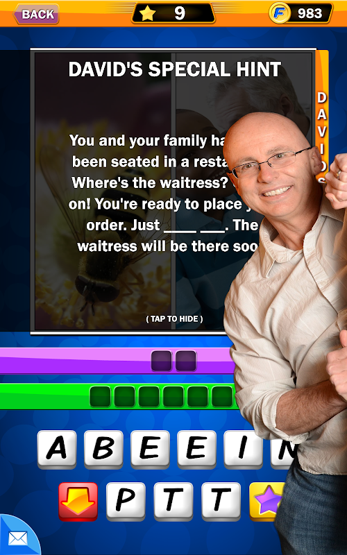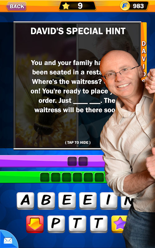 The picture is the clue. And every puzzle's answer is just 2 words -- a common pairing ("BUZZ OFF"), a famous character's name ("SNOW WHITE"), or a fun word combination that is forehead-slapping obvious after you figure out David's clues!