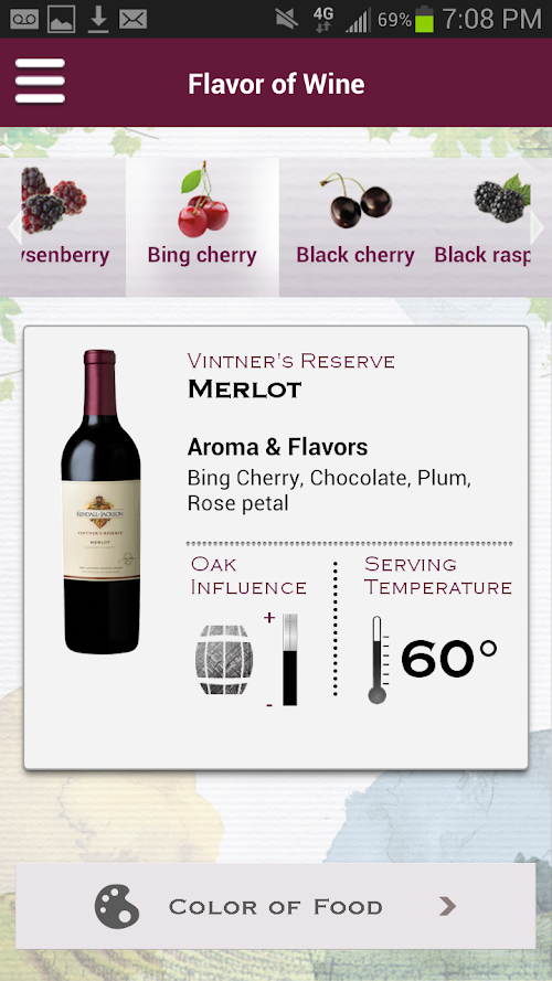 • Food pairing suggestions for meats, cheeses, fruits, vegetables, sauces and desserts.
