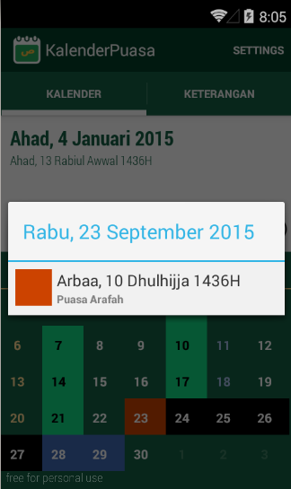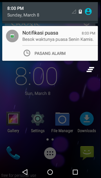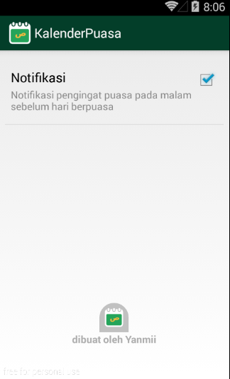 KalenderPuasa comes with a reminder feature (fasting notification to set an alarm) on the night before the day of fasting so that users who forget or do not know can learn and prepare for the next day fasting.