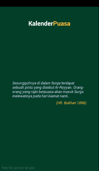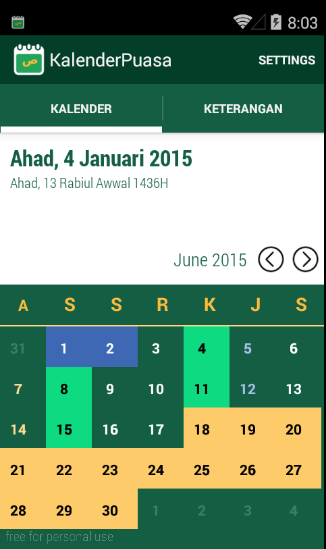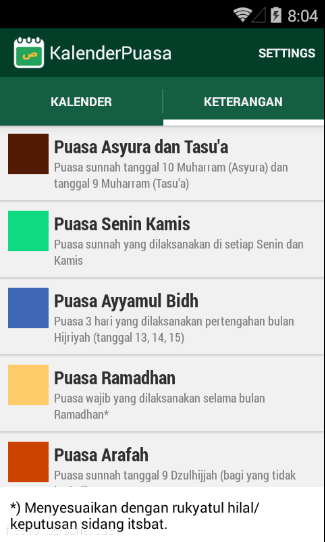 Semoga bermanfaat. Baarakallahu fiikum.Applications KalenderPuasa help us to know the day or dates of fasting, both sunnah fasting or fasting required. The date is adjusted for calendar fasting of Religious Affairs of Indonesia.
