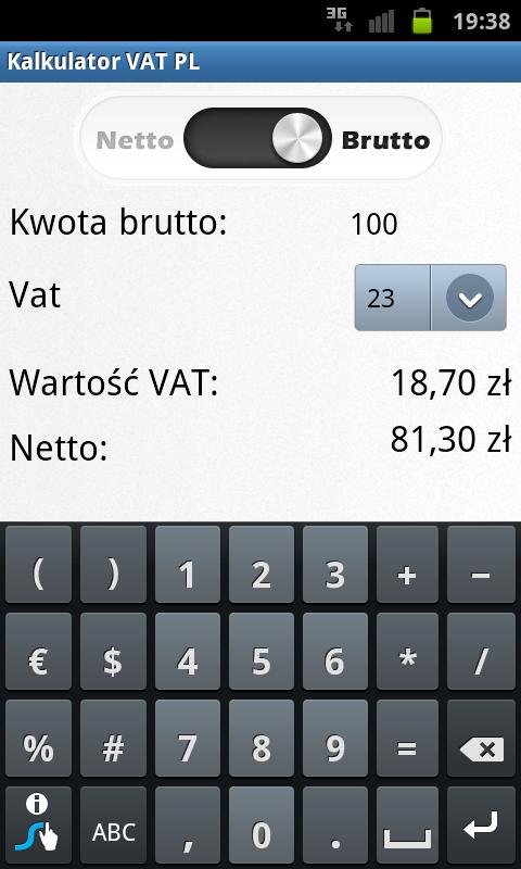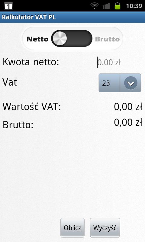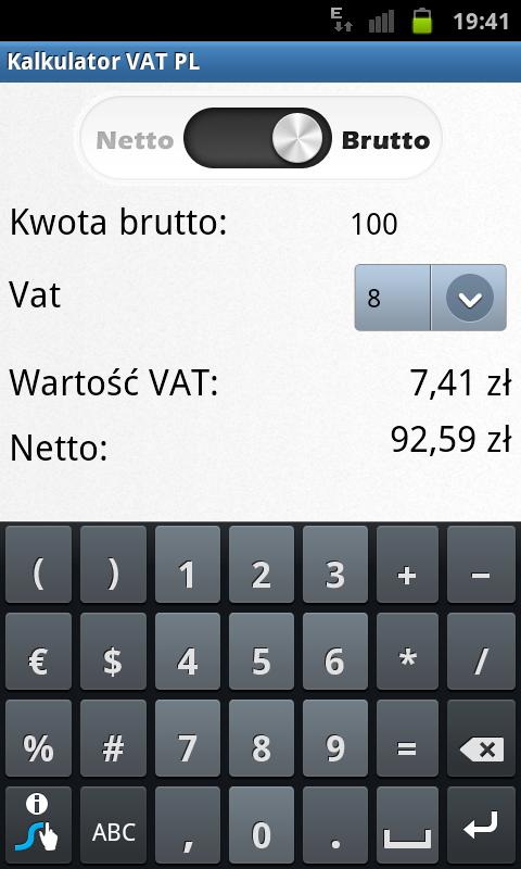 KALKULATOR NETTO/BRUTTO jest to prosta aplikacja, która pozwala nam w szybki sposób na obliczenie odpowiedniej kwoty przy wybranej odpowiedniej stawce VAT. CALCULATOR NET / GROSS is a simple application that allows us a quick way to calculate the appropriate amount at the selected appropriate rate VAT.