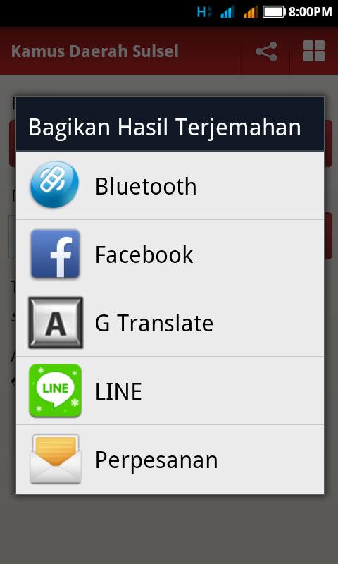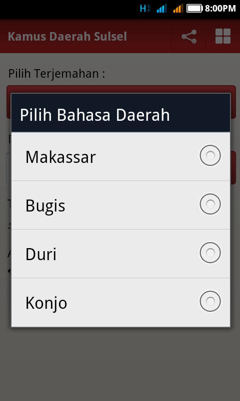 Kamus Daerah Sulsel is an application available for Android platforms are useful for translation indonesia language into the local language or translation local language into the Indonesian language which are in the province of South Sulawesi. Kamus Daerah Sulsel is the development of Kamus Makassar application.