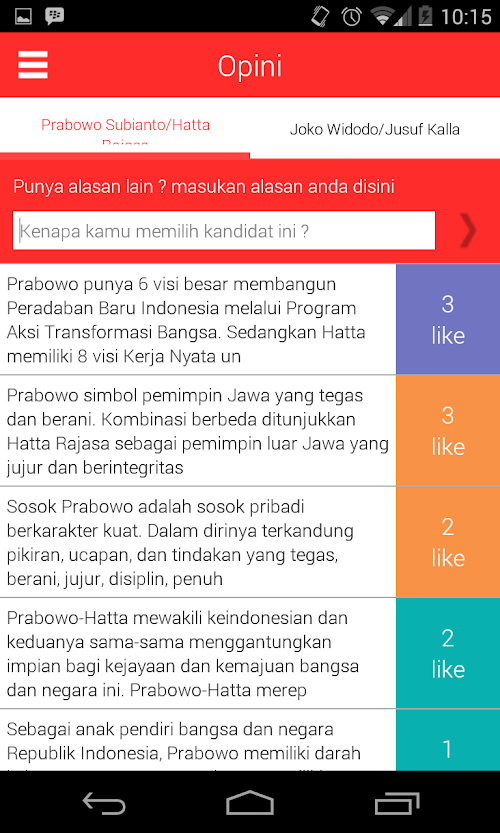 - memberikan kesempatan kepada pengguna untuk memberikan alasan kenapa mereka mendukung pasangan capres-cawapres tertentu
