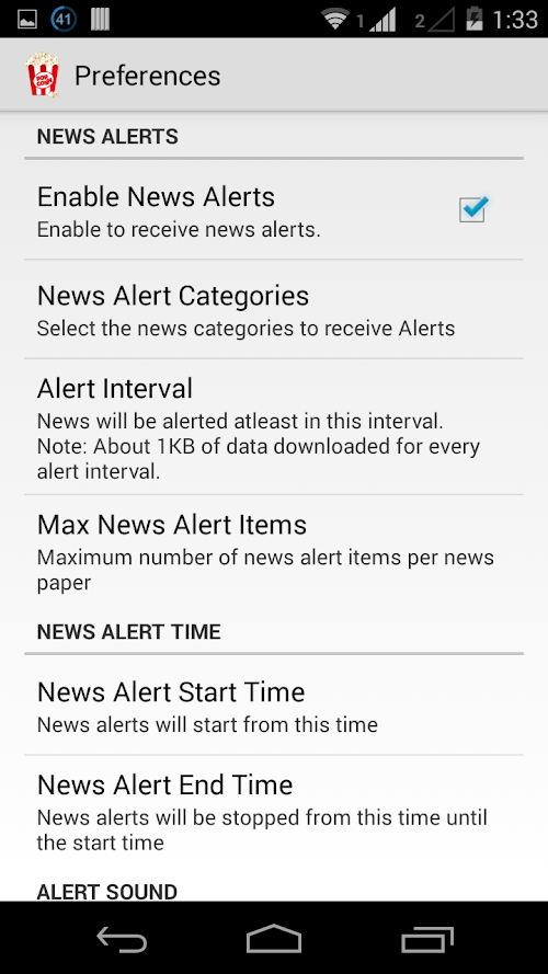 Enable news alerts as message notifications. You can configure the news alters by choosing your interested news site and its category. You can also define when you want to get alerts e.g. from 6:00 AM to 9:00 PM. You can also define how frequently get notification. E.g. every 15 minutes, every 1 hr, etc. Use Settings menu to configure the news alert options.