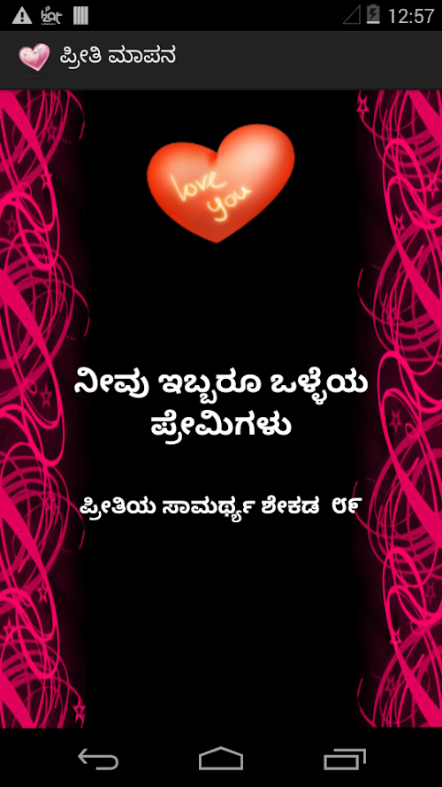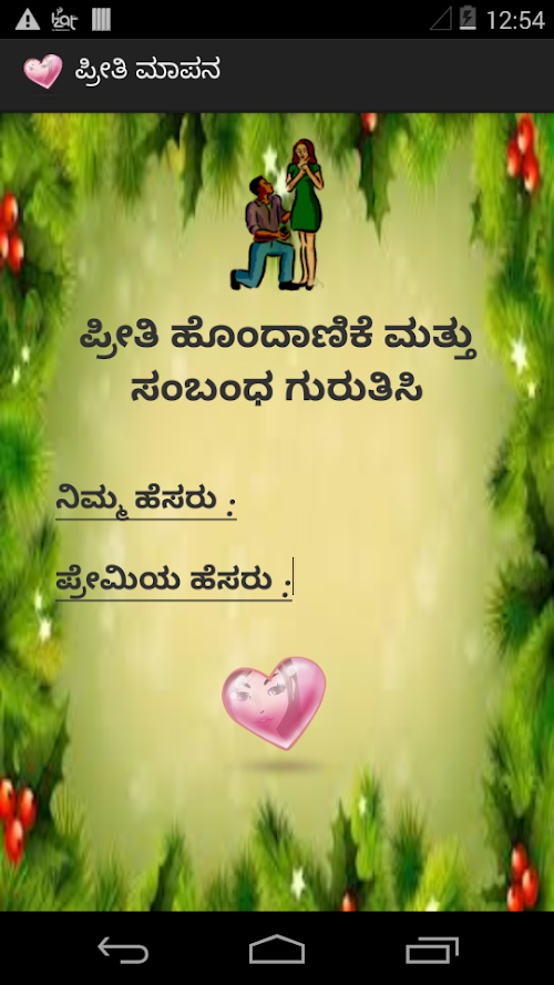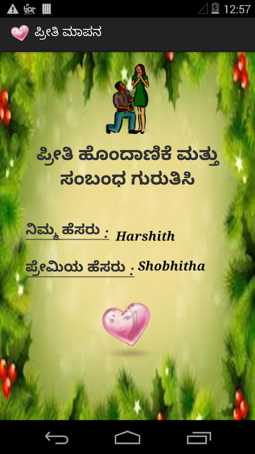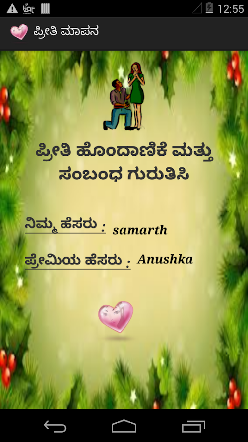 Kannada Love calculator is basically for kannadigas . It used to to find love compatibility and relationship success.It is based on male and female names.