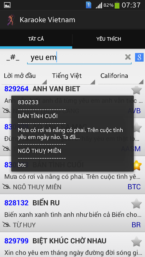 * Lưu ý: sau khi cài đặt, ứng dụng sẽ tải dữ liệu mới nhất cho lần chạy đầu tiên - các bạn vui lòng đợi giây lát!Vietnam helps you search karaoke songs simple and fast, including the following functions: