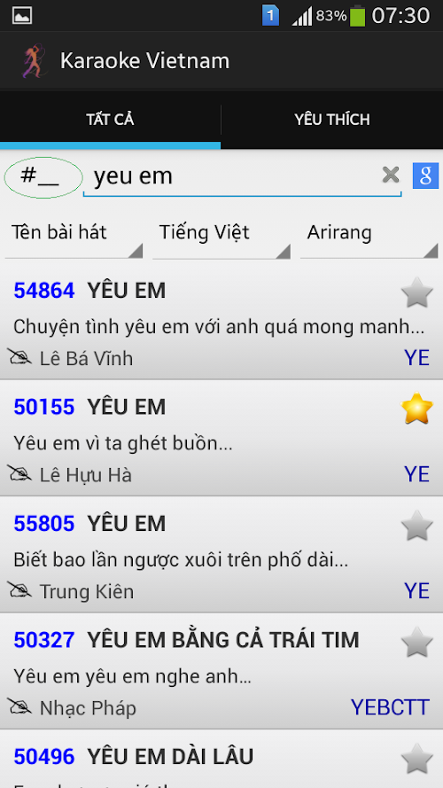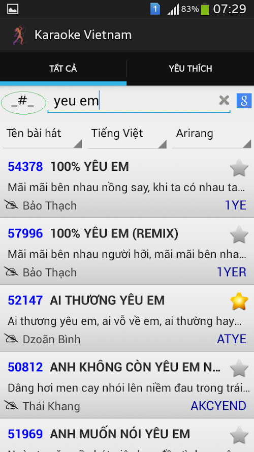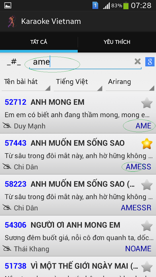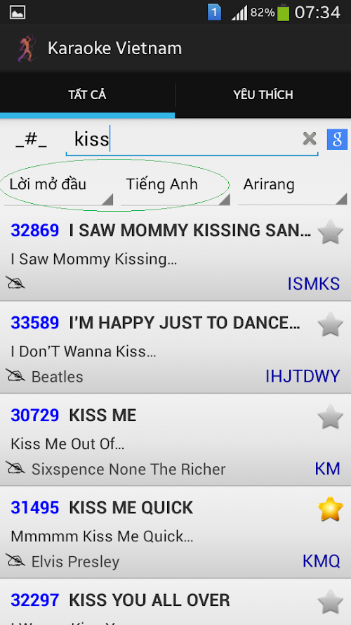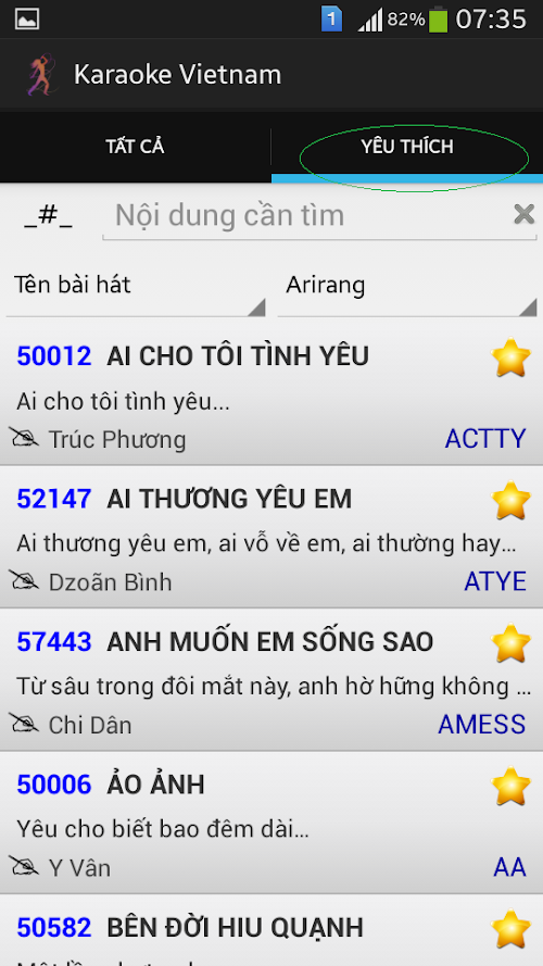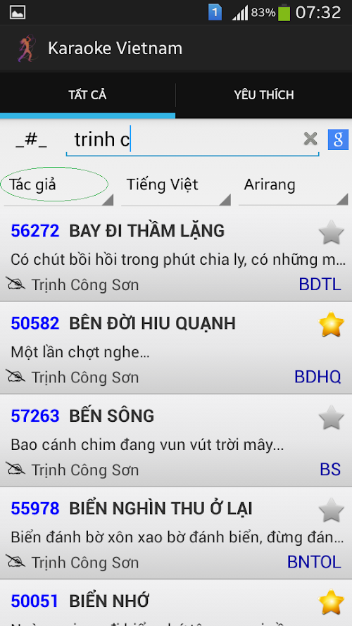 - Tìm nhanh bằng cách gõ vào các ký tự đầu tiên của bài hát.