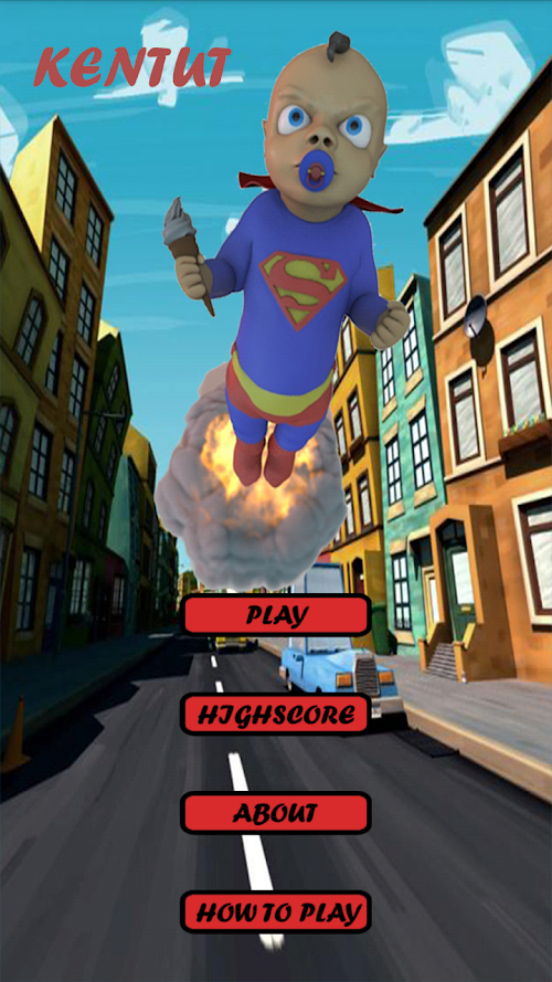 Selama terbang si anak akan menjumpai halangan-halangan seperti mobil ketika terbang. Ia harus menghindari halangan-halangan tersebut, karena jika menabrak ia akan jatuh. Selain itu, selama terbang si bayi juga dapat menemui makanan-makanan yang dapat diambil seperti, singkong, pete, jengkol untuk menambah bar kentut.This game depicts a little boy who was inspired by the movie Superman had just watched. He really wanted to be able to fly like Superman. To realize her desire to use farts as the impetus to fly, because he made a fart can make it fly. The longer the big fart or the child, the more distant flight. The objective of this game is to help young children reach his goal is to be Superman, but because they can not fly like Superman, then he can use to fly farts. To be issued farts he should eat foods that can stimulate farts.