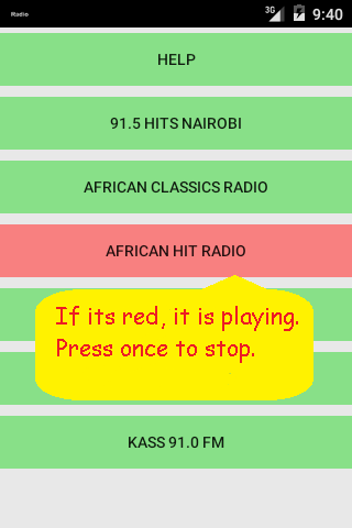 To play, just press any radio station button. Button color is red, if its playing, and green if its not.