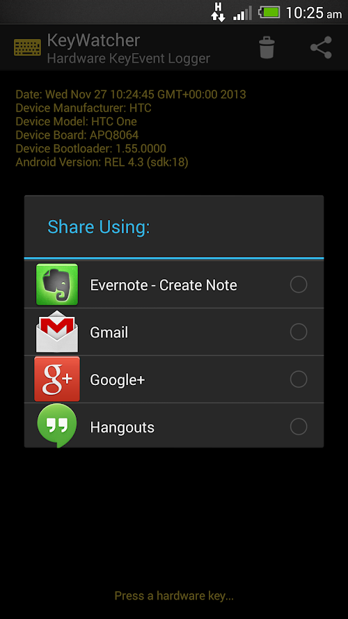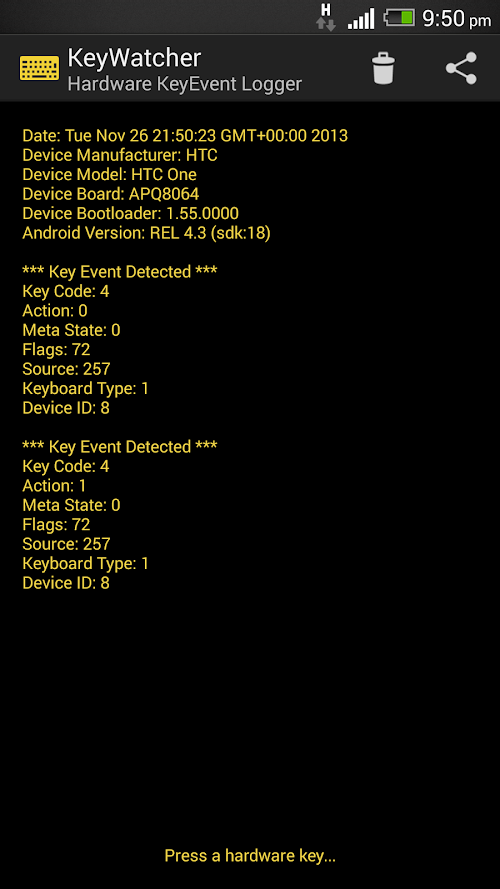 A quick way for users to log hardware KeyEvent information and share it back with developers.