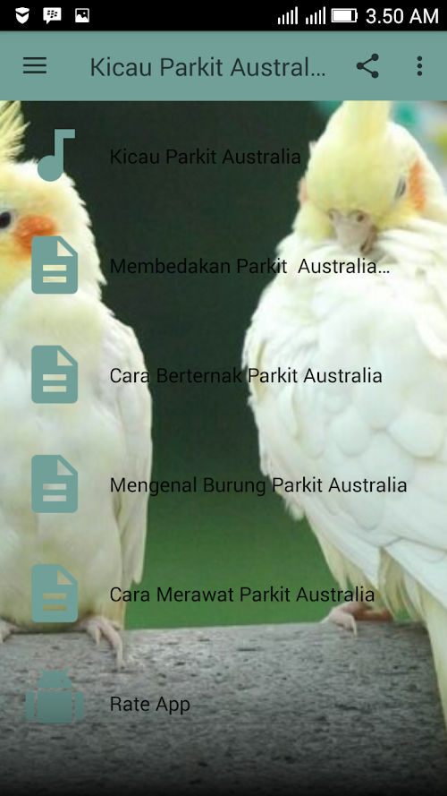 Aplikasi Kicau Parkit Australia Terbaru merupakan sebuah aplikasi yang didalamnya berisi kicauan burung parkit Australia pilian yang berguna sebagai masteran, pancingan burung parkit Australia agar tetap gacor. Aplikasi ini berisi tips-tips tentang parkit Australia