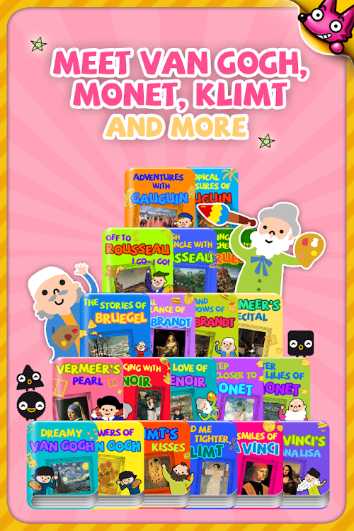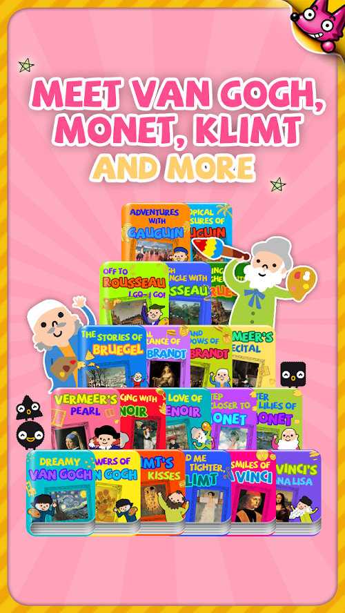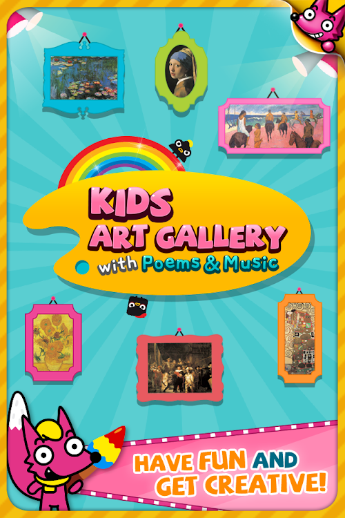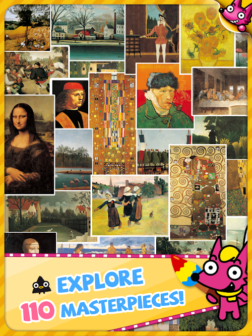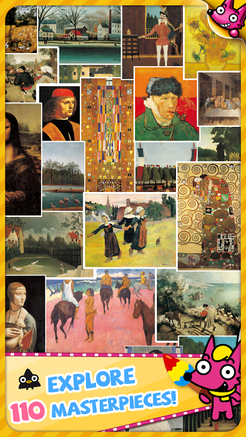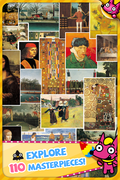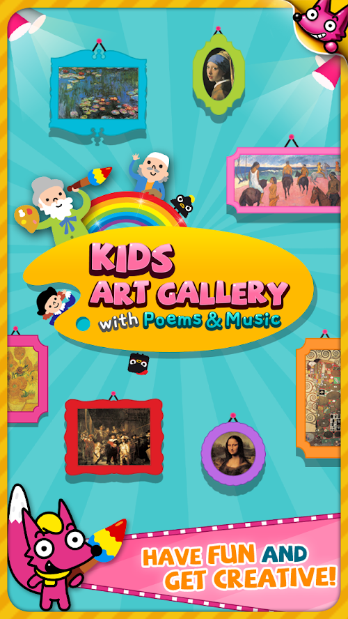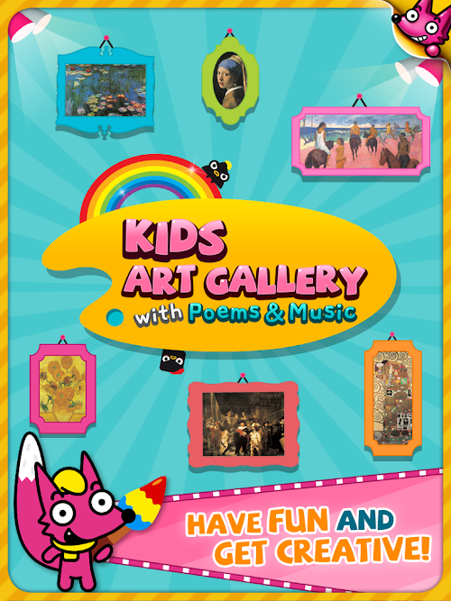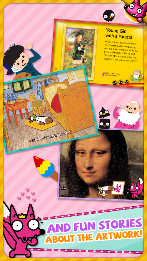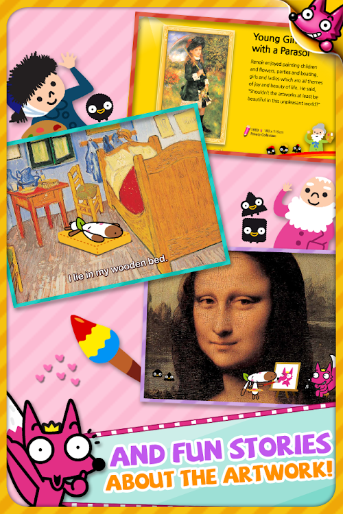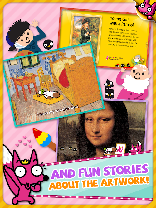 People who experience art masterpieces as a kid grow to have interest in colors, lights, shapes and even every object around us. [Kids Art Gallery] is created for kids to experience art in a more fun and easy way! The cute little characters dance and play inside the artwork while the narrator recites a rather whimsy poem about the scene. These poems are actually written by kindergarteners aged 3-6. There are also commentaries based on real stories of the artwork to help kids understand the masterpieces.