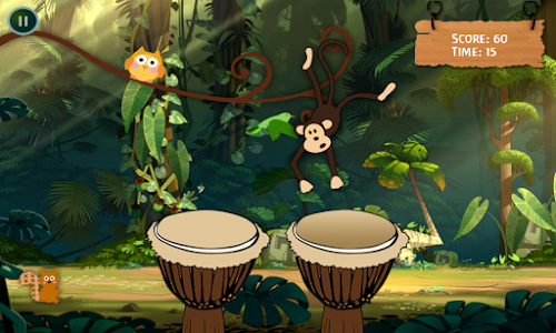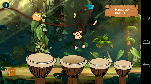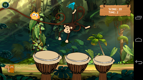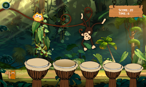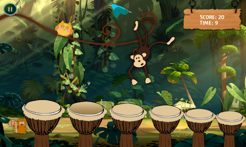 Play the drums in Rhythm and make the monkey dance. Faster you play, faster the Monkey dance. Collect enough point to make the monkey fall from branch. Its simple and fun. Doesn't matter if you don't know, how to play drums. Just touch the drums, they will play in rhythm for you automatically. Birds, Monkey, Owl, Squirrel will also sing with you, just touch them. Kids love and enjoy it. These drums produce the sounds of congo and bongo, similar to african drums.