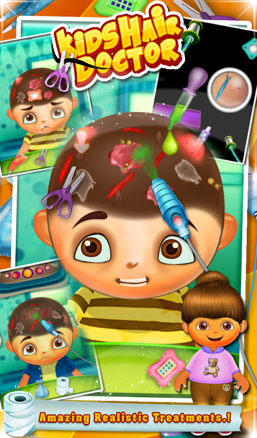 These cute little kids are injured while playing. So start treatment by choosing from four adorable kids, you can use many different kinds of medical tools to treat the babies. Here you can do all the following things for them, such as use your handy toy hair slenderer and trim hair, use scissor to cut remaining hair, bandages to stick over injury. Use twizzer to take off all insects from head, ice cube to remove swelling, use plaster to recover from injury. Then use X-ray to look for broken bones. Sometimes it's hard to know what's wrong with a baby, but with your help and expertise, you can get them healthy in no time