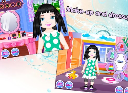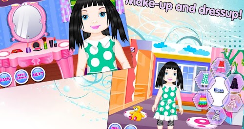 When you are ready with the haircut of the kid in your hair studio you can go further with the makeup. Choose her eye color, eyebrow, eyeshadow, brush and lipstick. And for the finishing touch you can choose nice clothes to dress her up in the beauty salon. Choose a dress, a head, shoes, gloves that fit by her new hairdo. And give her, her favourite toys. It’s almost a spa salon for kids! When everything is done you have given the kid a real makeover! You can save your hair creation on your tablet or mobile so you can show it to everyone! Are you a real beauty hairstylist or do you want your own hair studio? Download hair salon hairdo and be a hairstylist who can make every haircut!