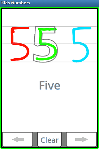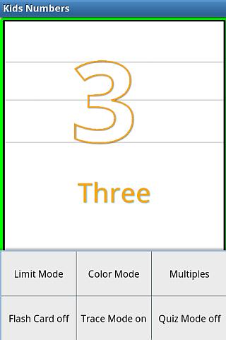 1) Trace Mode - Kids can learn to write the numbers with the tracing mode. Tracing can be done with different colors. Color Mode have options to pick the different colors to trace a number with fingering.