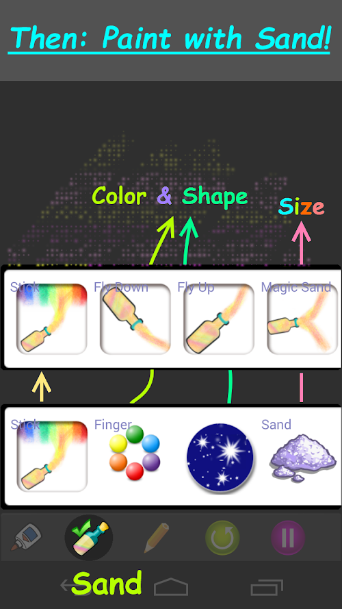 With Kids Sand Draw, you can use 3 categories of novel "paint" brushes to start the doodling: