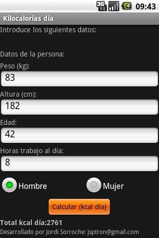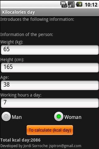 KILOCALORIES DAY is a simple but useful program to calculate the kilocalories that a person needs a day depending on the information of Weight, Height, Age, Working hours and Sex.