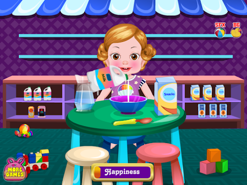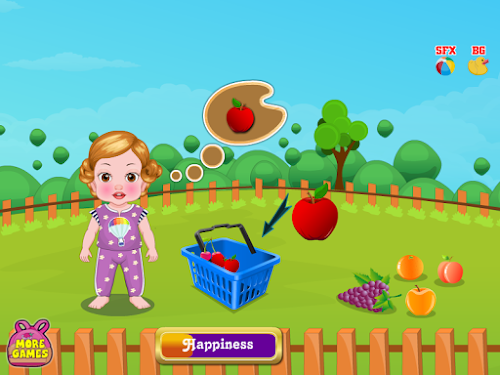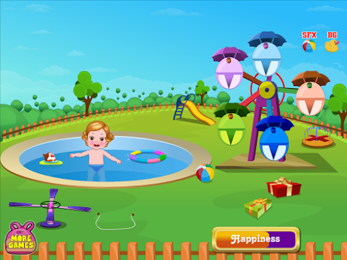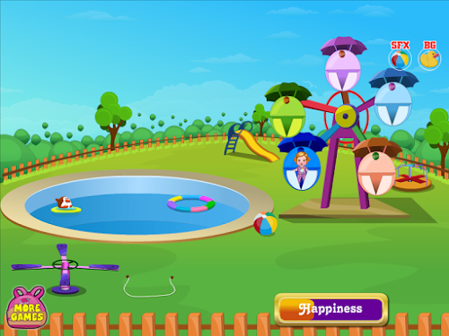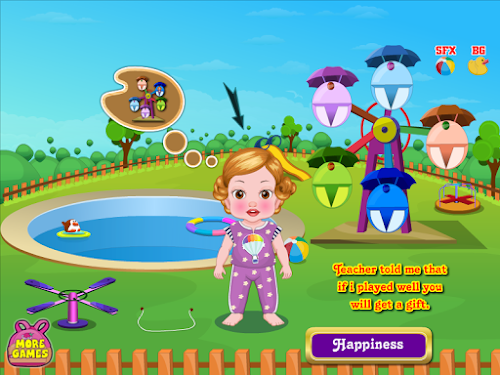 In this game you have to take care of Donna beacuse she is going for the first time in kindergarten. She does not know what happens there, so you have to make them as beautiful day. Little Donna can even learn and play at the same time, so you should try to combine things together and make them pleasing. You have to make them feel good and take care of it. For starters, we help to paint because it wants to draw a pig but it hasn't very good hand. You have to draw and then paint it with the colors of his choice. It seems that the little Donna was getting hungry so we must prepare them meals. Tried to prepare a bowl of cereal, which add some honey and then you have to feed. Then you must go out in the backyard and play with Donna. You need to pick some fruit that she will eat later, need to learn her to jump rope and you have to spin her into a carousel. It looks like kindergarten program for today ended so little Donna will go home. We invite you to choose and other games for girls in this category to be able to practice more how to care for a small child or others people.