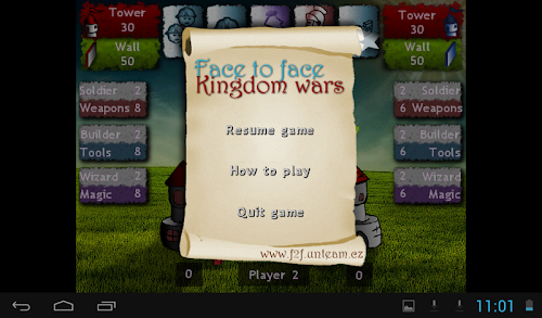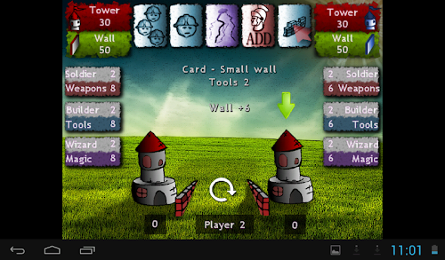 Kingdom Wars is a strategy card game for two players in which fight two kingdoms against each other. Each kingdom builds its own tower and trying to harm an opponent as efficiently as possible . Each player has 5 cards. There is required a certain amount of resources to each card (weapons , tools and magic ). This makes each card can be used immediately , but you need to collect the required amount of resources. The game is won by the person who first build its own tower to 100, or one that destroys an opponent's tower to level 0.