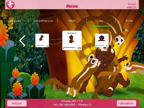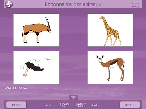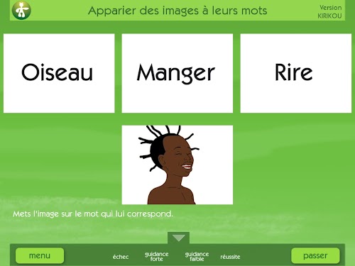 - Language comprehension. Here they will learn to recognize common nouns, verbs, adjectives, animals, characters, all taken from Kirikou films. They will also learn to understand the denial and prepositions.