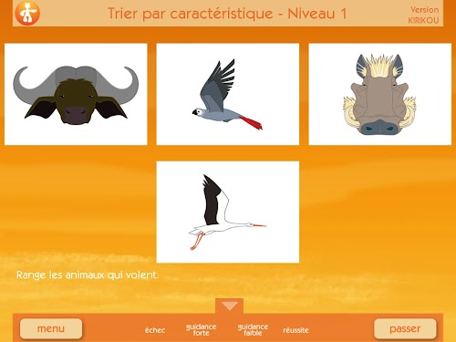 - Compréhension du langage. Ici, ils apprendront à reconnaître des noms communs, des verbes, des adjectifs, des animaux, des personnages, tous tirés des films Kirikou. Ils apprendront aussi à comprendre la négation et les prépositions.