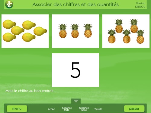 - Catégories et les connaissances cognitives. Dans cet axe, les enfants apprendront entre autres à ranger des images qui vont ensemble, se ressemblent, ou font partie de la même catégorie. Ils feront aussi des puzzles de difficultés croissantes.