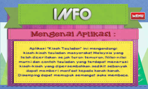 The purpose of this mobile application is to introduce the user about folklore story in a wide range so the Malaysian culture spread all to the world about identity of our culture. More than that, this mobile application uses an android as a platform to attract the interest of the targeted user by adding a multimedia element such as text, graphic, audio, animation and interactivity.