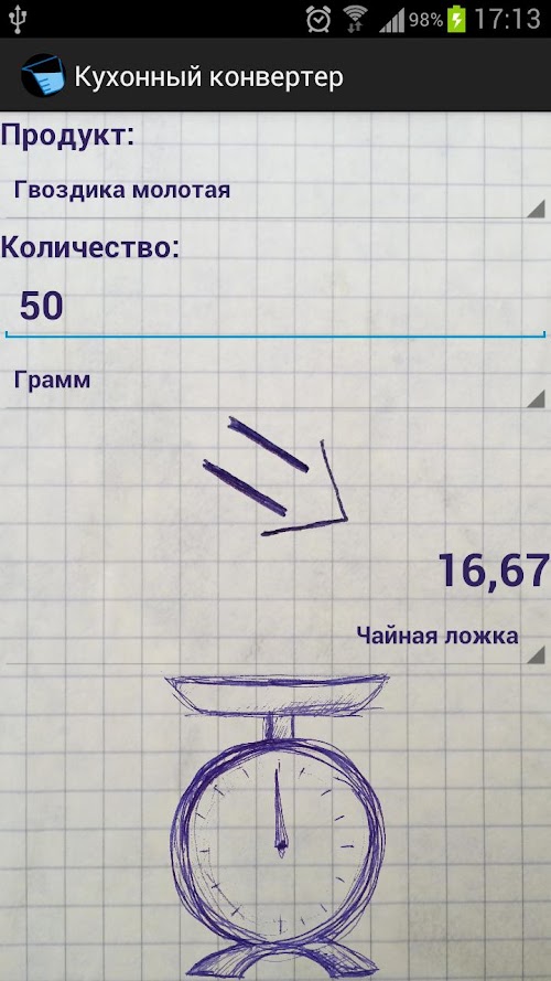 If you need to know weight of some Product in one spoon (or some else) this program will help you. Wihout scales.