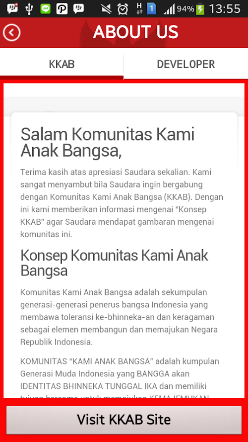 KKAB Android Apps merupakan aplikasi news dari "Komunitas Kami Anak Bangsa". Aplikasi ini akan memuat informasi dari web KKAB, dan akan mendapatkan notifikasi ketika ada pembaruan artikel.