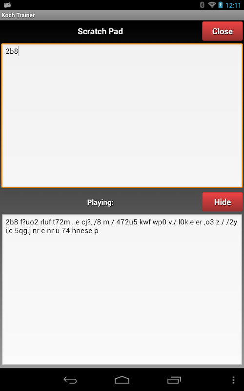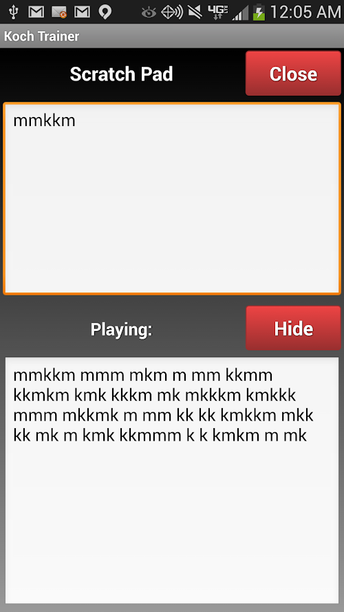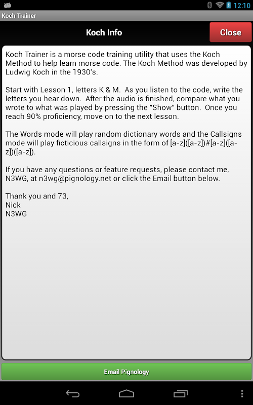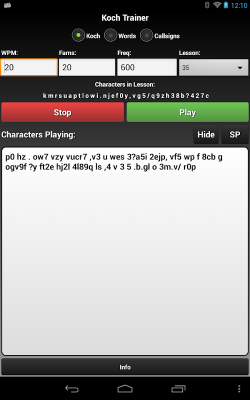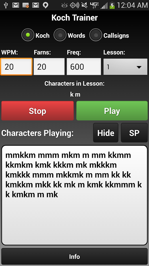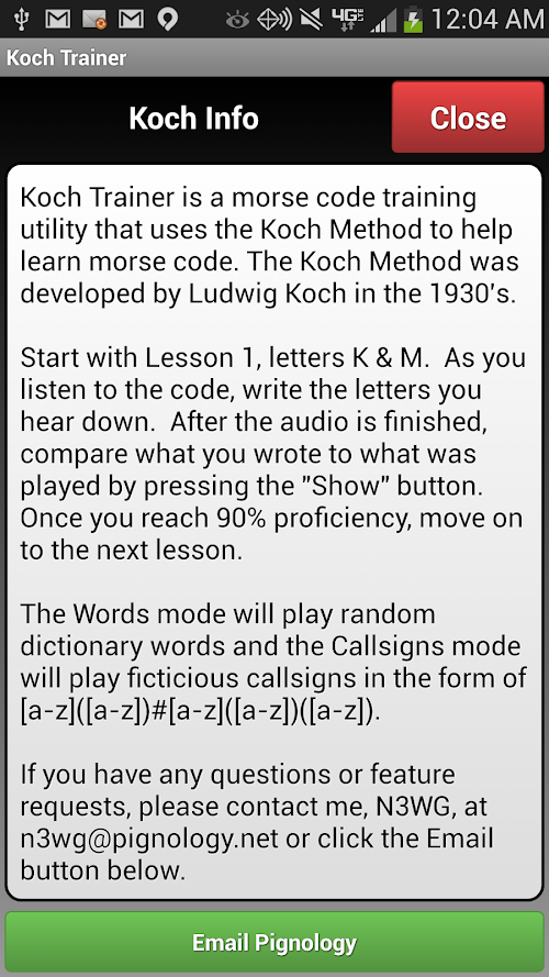 Koch Trainer is a morse code trainer that uses the Koch Method developed by the German psychologist Ludwig Koch in the 1930's. The method basically states that you should learn morse code at the speed you expect to receive, by training your reflexes to respond to code sent at 20 WPM you'll learn the code much faster.