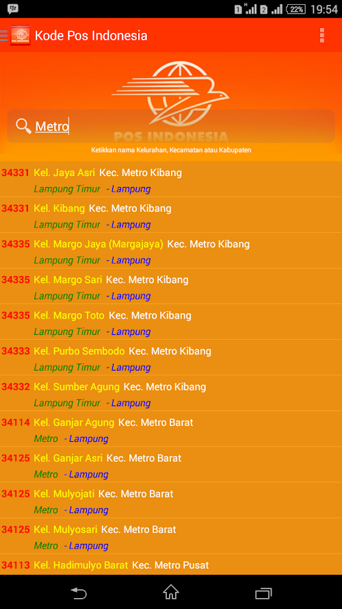 aplikasi ini menyajikan data kode Pos di seluruh wilayah Indonesia dengan Cepat, anda cukup mengetik nama kelurahan, kecamatan atau kabupaten kota di menu pencarian, dan data Kode Pos akan muncul dengan live search sesuai kata yang anda masukkan.This application presents data ZIP code throughout the territory of Indonesia with Quick, you can simply type the name of the village, town or district in search menu, ZIP code and the data will appear with the appropriate word live search you entered.