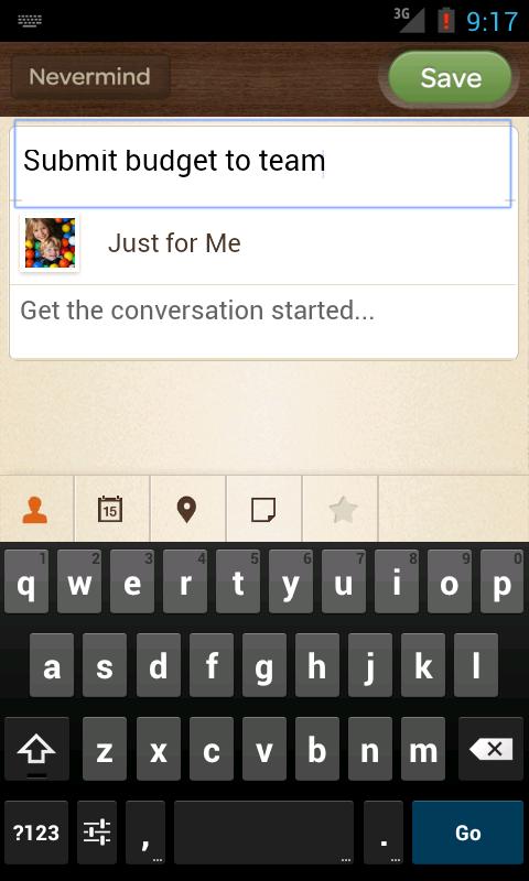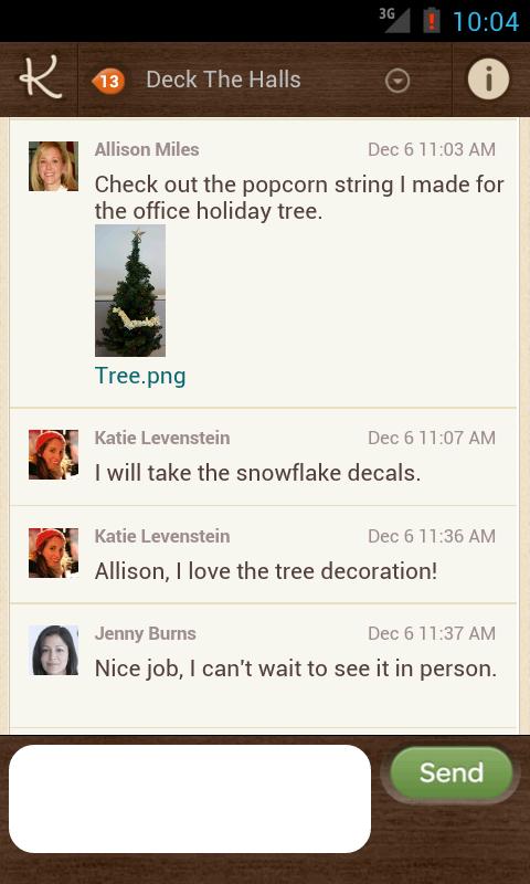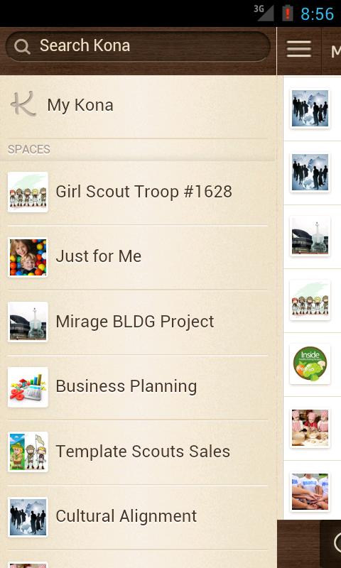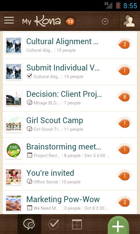 - Each Kona space provides group conversations and file sharing in context of the tasks, calendar events, and purpose of the group.