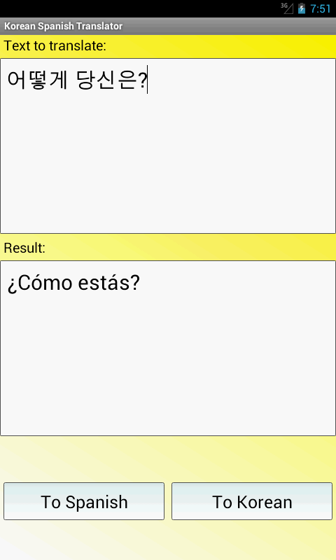 This app is able to translate words and texts from korean to spanish, and from spanish to korean. Very useful app for easy and fast translations, which also works like a dictionary!