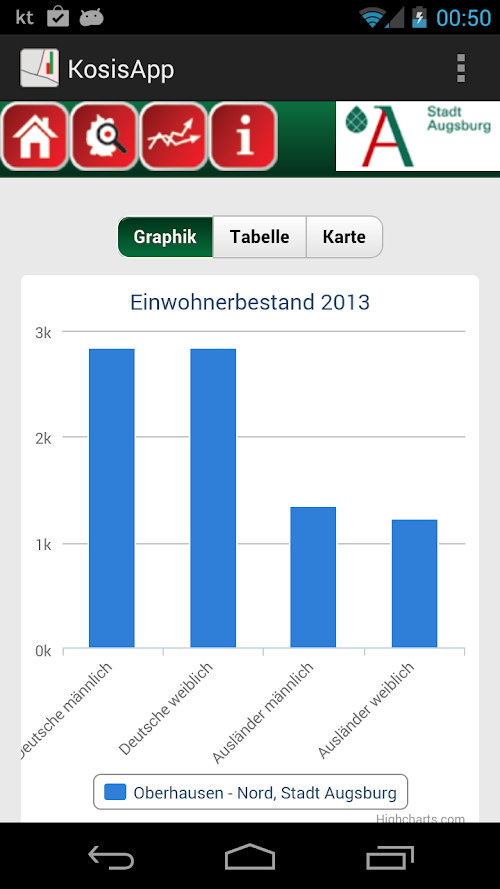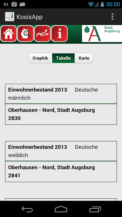 Mit ihr können verschiedenste Statistiken wie z.B. Bevölkerungsstruktur, Bevölkerungsentwicklung oder diverse Städtestatistiken betrachtet werden.The kosis app is an app for inspection of small-scale neighborhood data with geo reference.