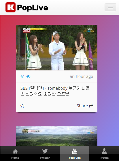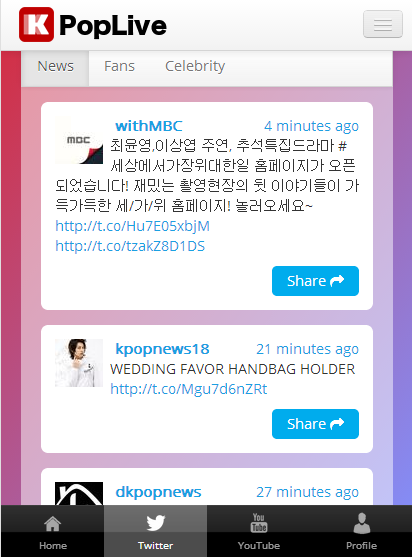 If you wish to receive the latest K-pop happenings, twitter feeds, videos from your favourite K-Pop stars, this app is designed specially for you. Receive the latest tweets and YouTube videos of your favorite K-Pop artistes and share them with your friends via Twitter, Facebook or Google+!