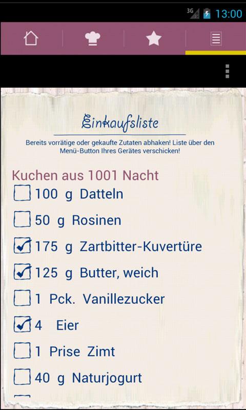 Setzen Sie alle Zutaten, die Sie für Ihre Rezepte benötigen, auf unsere interaktive, praktische Einkaufsliste. Und: Streichen Sie jene Zutaten ab, die Sie nicht brauchen oder bereits vorrätig haben