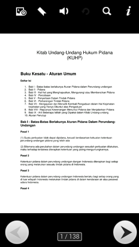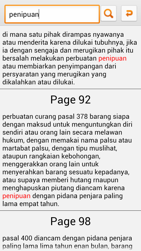 Melalui aplikasi android ini anda dapat mencari beberapa pasal serta ayat dalam KUHP yang bisa anda jadikan referensi. Jangan khawatir karena aplikasi ini anda dapat gunakan kapan saja sebab tidak membutuhkan jaringan internet.
