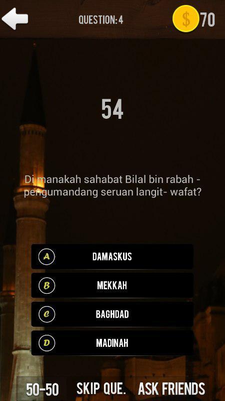 - fitur 50:50Prominent Islamic Quiz is a quiz game / trivia that contains questions that must be answered.