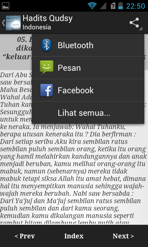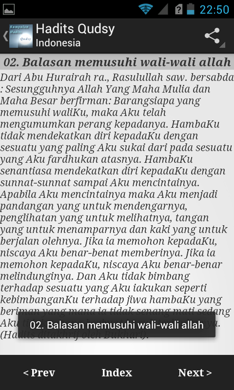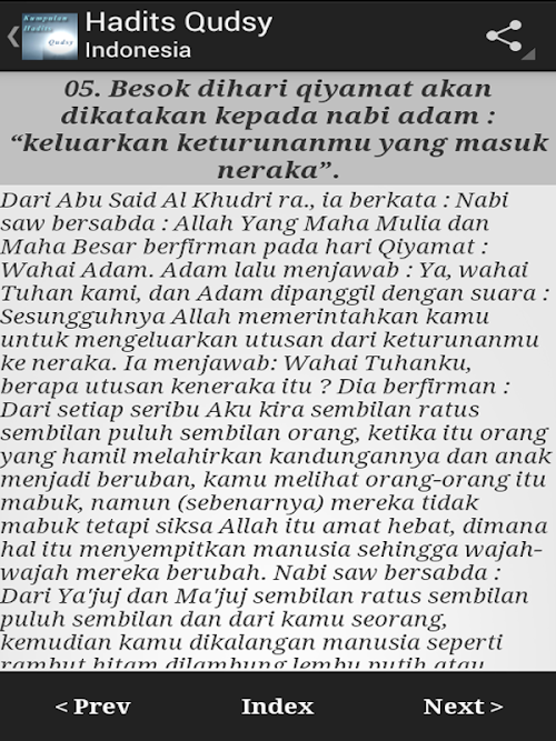 Terima kasih.This application is an application that contains a collection of hadith Qudsy / Qudsi. You can see the content of hadith, and also use the share feature to share the hadith that you read to your family and your colleagues, either using the chat application, twitter, facebook, or just mencopykannya to the clipboard for transfer to other applications.
