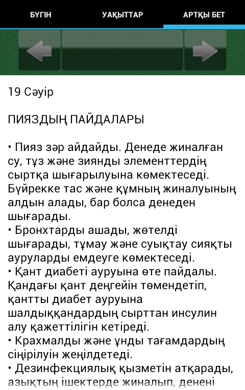 "Artқy bet" Degen bөlіmde әһli sүnnet ғұlamalarynyң kіtaptarynan alynғan dіni sұhbattar, nasihattar, Tarikh-i Madeni derekter, densaulyққa paydaly keңester, tәlіm-tәrbiege negіzdelgen maқalalar siyaқty zhalpyғa қazhettі mәlіmetter қamtylғan. Sogndal-Ak mұndaғy card arқyly tұrғan zherіңіzdің қybla baғytyn yes anyқtau mүmkіndіgі bar. Ayyna bіr retract internetten uaқyttardy zhүktep tұru Kerek. Yaғni kelesі ah bastalғanda Zhana aydyң uaқyttaryn avtomatty tүrde internetten zhүkteydі.