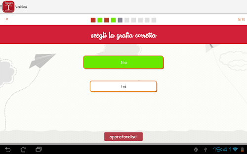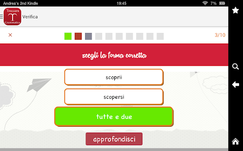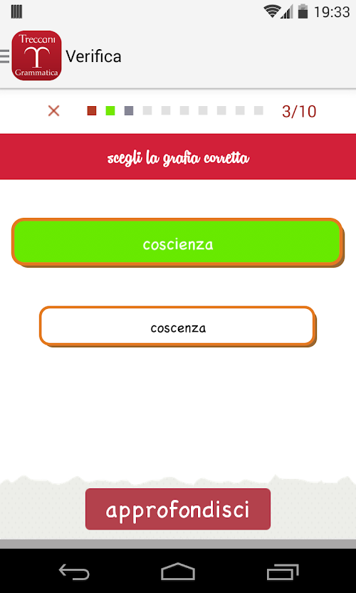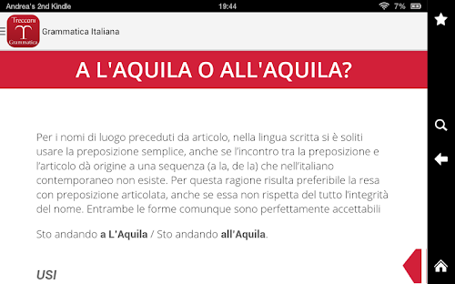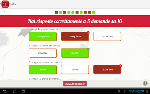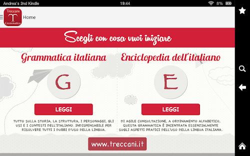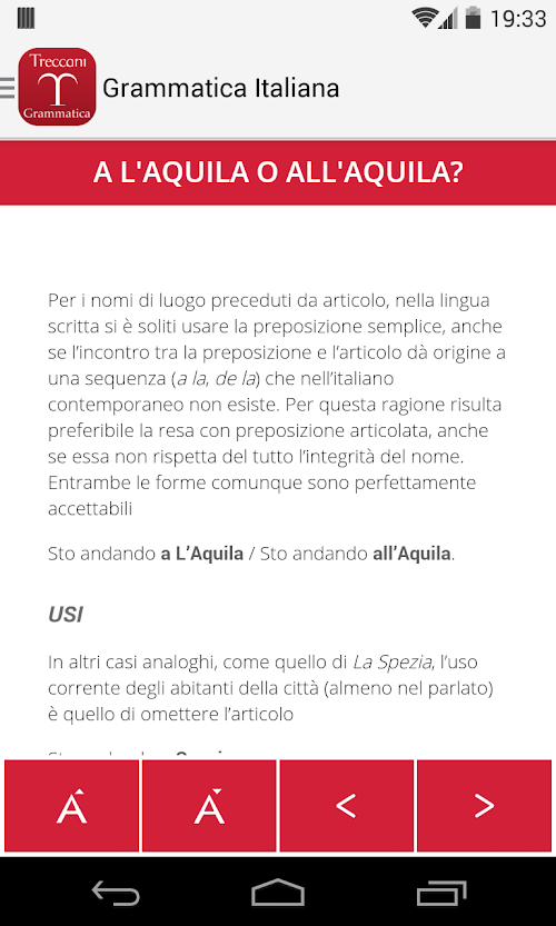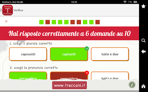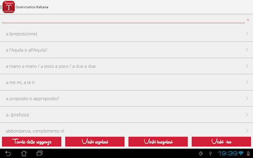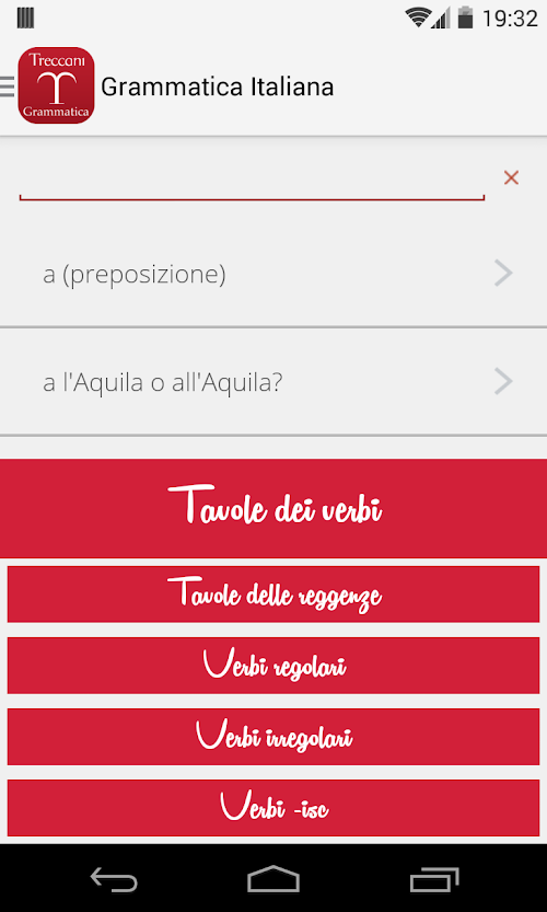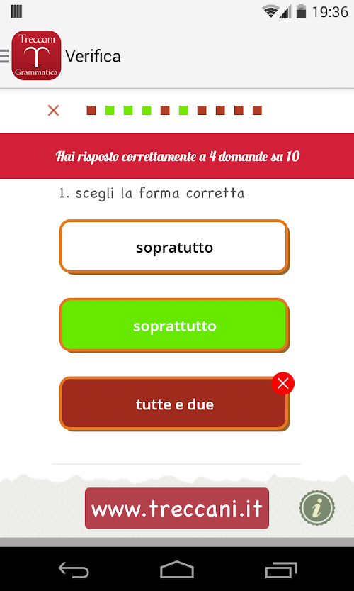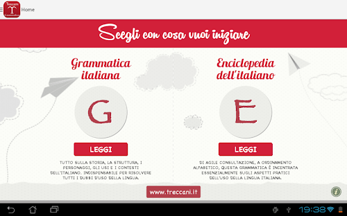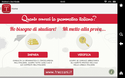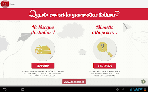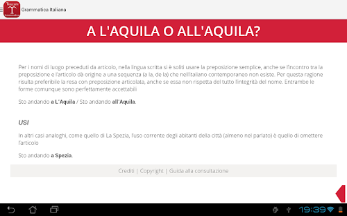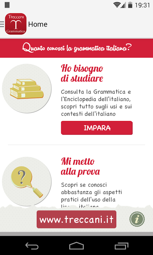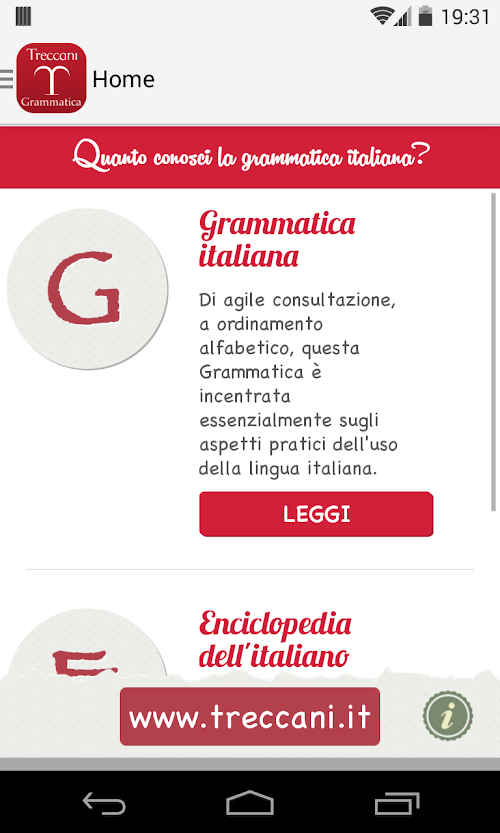 Conosci abbastanza gli aspetti pratici dell'uso della lingua italiana? Mettiti alla prova rispondendo alle domande del quiz e consulta la sezione informativa per approfondire ogni argomento. L’applicazione utilizza la base dati della Grammatica Italiana e dell'Enciclopedia dell'Italiano pubblicate dall’Istituto della Enciclopedia Italiana fondata da Giovanni Treccani. La consultazione alfabetica delle voci della grammatica e dell'enciclopedia dell'italiano consente una rapida risposta a quesiti e dubbi specifici. Gran parte delle voci rispondono alla domanda "come si dice o come si scrive", cercando di dare indicazioni chiare sull'uso linguistico migliore e sulle scelte da prendere di volta in volta. Quest'applicazione risolve dubbi su: pronuncia, grafia, presenza di consonanti doppie, uso degli articoli, formazione e uso del femminile e del plurale di alcuni sostantivi, uso dei superlativi di alcuni aggettivi, coniugazione dei verbi, selezione dell'ausiliare nei tempi composti, uso delle preposizioni e singole espressioni o costrutti. Ad integrazione delle voci, la consultazione delle tavole delle reggenze, dei verbi regolari, dei verbi irregolari e dei verbi in -isc.Been quite the practical aspects of the use of the Italian language? Test yourself by answering the quiz questions and for further information please read each topic. The application uses the database of the Encyclopedia of Italian grammar Italian and published by the Institute of the Italian Encyclopedia founded by Giovanni Treccani. The consultation alphabetical entries in the encyclopedia of Italian grammar and enables rapid response to specific questions and concerns. Most of the voices respond to the question "how do you say or how to spell it," trying to give clear guidance on using linguistic and better choices to make from time to time. This application solves doubts on: pronunciation, spelling, presence of double consonants, use of articles, training and use of the feminine and plural of some nouns, use of superlatives of some adjectives, verb conjugation, selection of the auxiliary in compound tenses , use of prepositions and individual expressions or constructs. In addition to the rumors, the consultation of the tables of the regencies, regular verbs, irregular verbs and verbs in-isc.