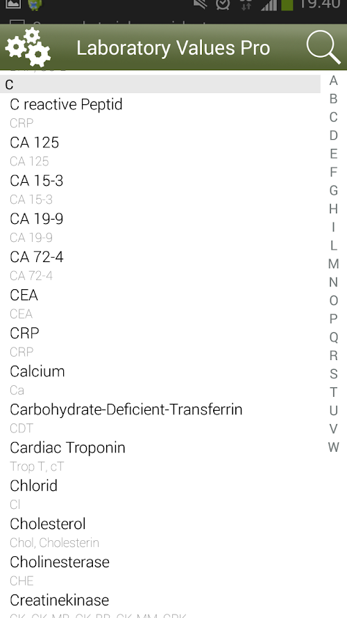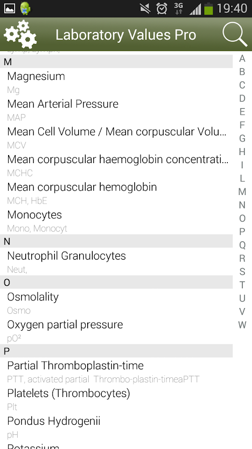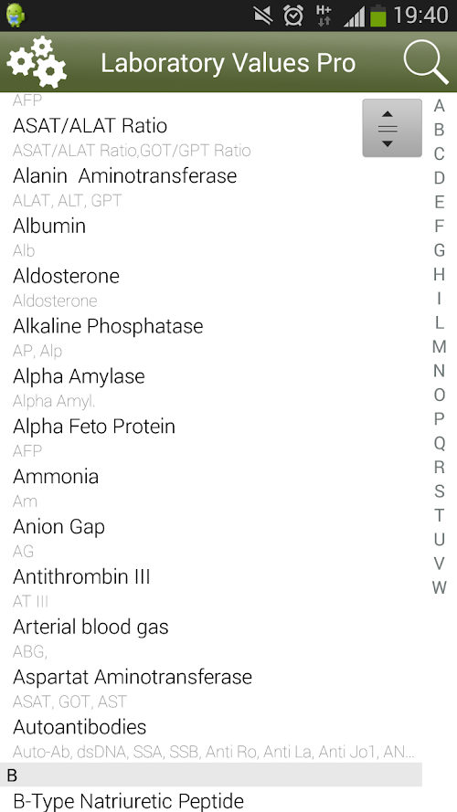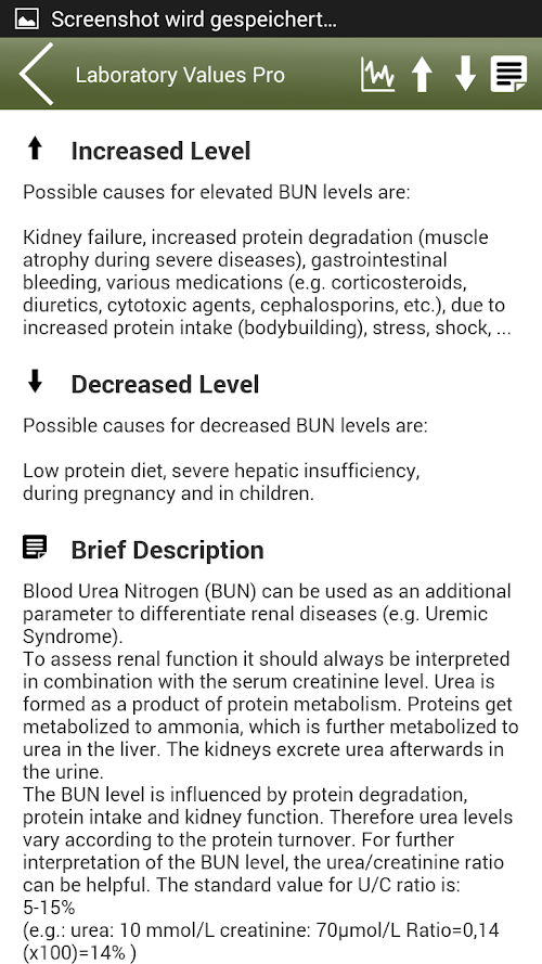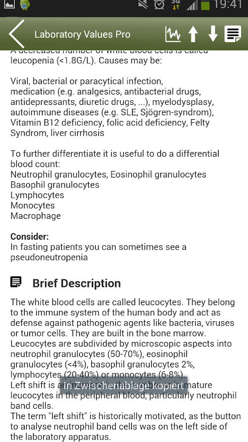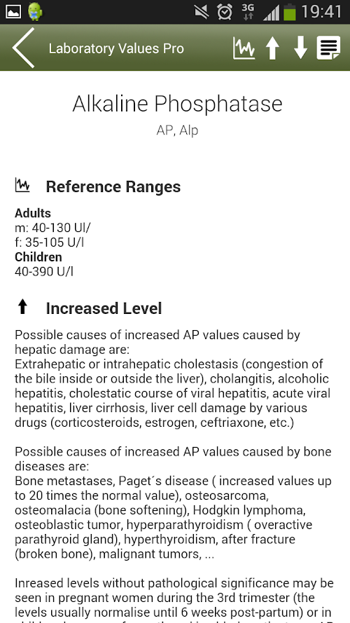 Laboratory values Pro gives both non-medical readers and health professionals a fast-navigable and clearly structured overview of the main routine laboratory parameters and possible causes of their increase and decrease. The laboratory values are clearly arranged, alphabetically ordered and quickly located in the menu. The standard values are specified both in the old units and SI units. For each laboratory value a short information is quickly retrievable. The individual briefings are generally formulated to understand and give an overview of the indications, function and task of each laboratory value. Basic laboratory values gives the user an overview of the main routine laboratory parameters including hematology, blood count, clinical chemistry, coagulation, Quick, INR, electrolytes, tumor markers and blood gas analysis. The program enables besides the classic scrolling a quick navigation between the laboratory name, an abbreviation of the laboratory value, normal range of the value and differential-diagnostic interpretation of increase and decrease of the value. An additional search bar allows you to search specifically for the desired laboratory value.