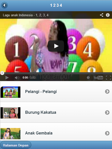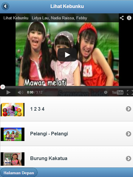Lagu Anak Terpopuler berisikan video lagu anak-anak yang saat ini sedang populer dikalangan anak-anak. Lagu anak-anak terpopuler ini sangat cocok untuk anak-anak anda karena selain anak-anak menjadi riang tanpa sadar kita sudah mengajaknya mengenal lingkungan dan belajar.