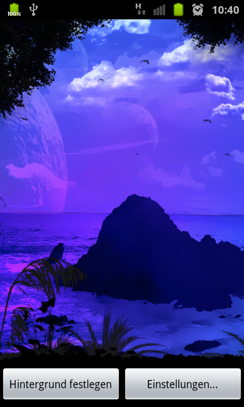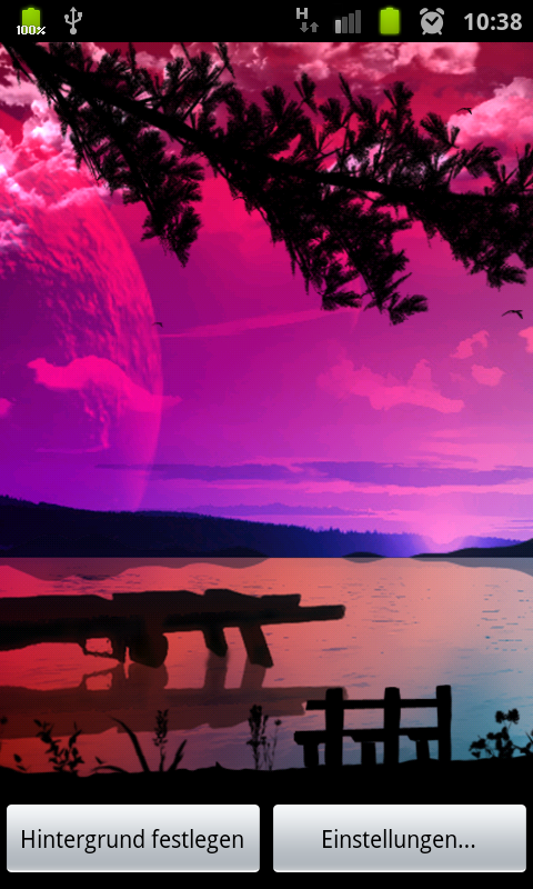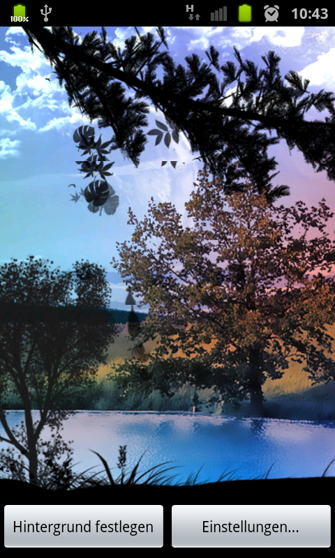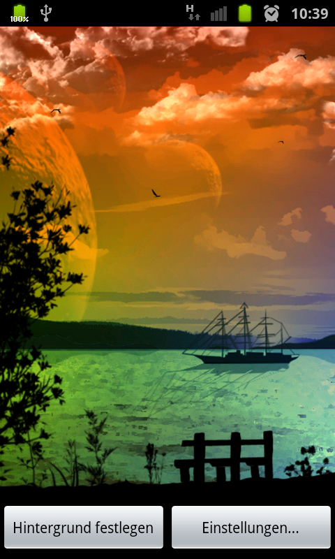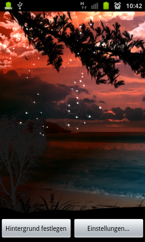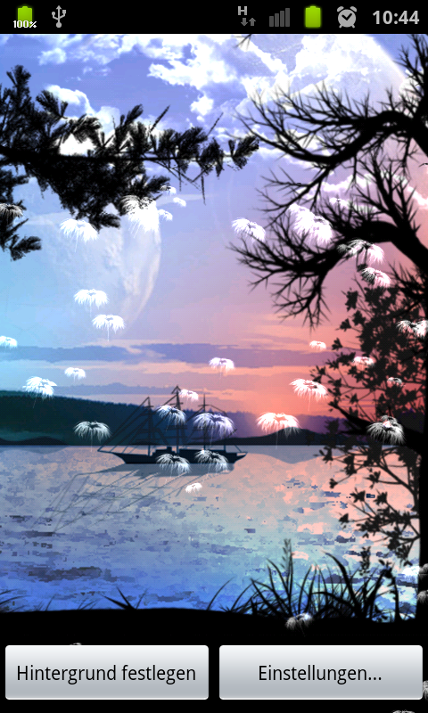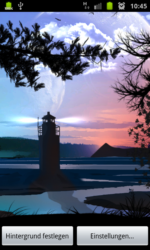 Create your own romantic “Lake view”. Choose between a lighthouse with its moving lights, the reef with a rock in the breakers or a sailing ship. The Full version comes with fife different lakes and you can watch it from a park bench or take a glance from the forest. The “Lake View Scene” gets complete by different beautiful skies and you can arrange the whole scene in various colors. If you touch you screen, particles appear like lightning bucks.