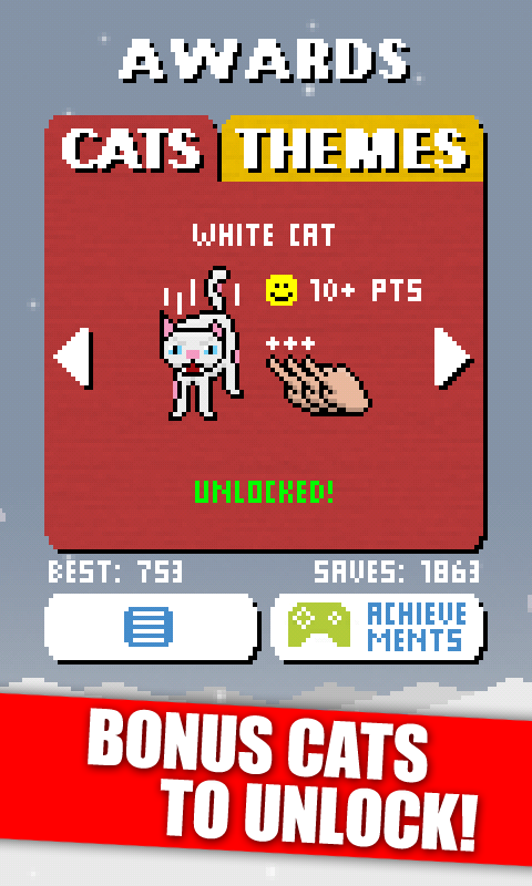 Unlock the bonus pixel cats, each with unique behaviour, to improve your score. Land them all!
