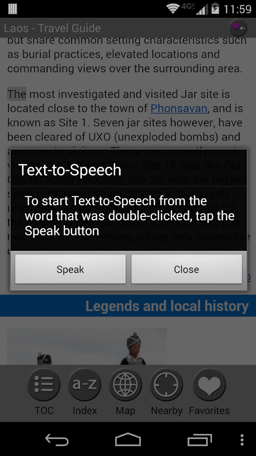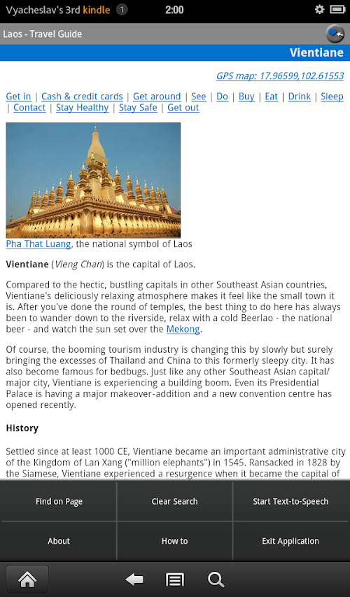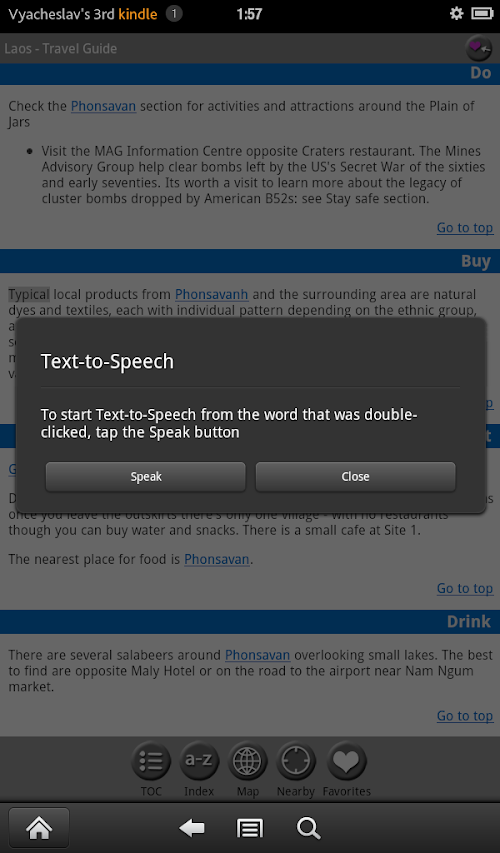 This fully-functional guide is absolutely free. The full version (only $4.99) adds Text-To-Speech and expands articles with more information about attractions, history, culture, itineraries, phrasebooks and more. Listen to complete articles on the go with Text-To-Speech: double-tap on a word to start Text-To-Speech from the selected word or select Menu > Start Text-To-Speech.
